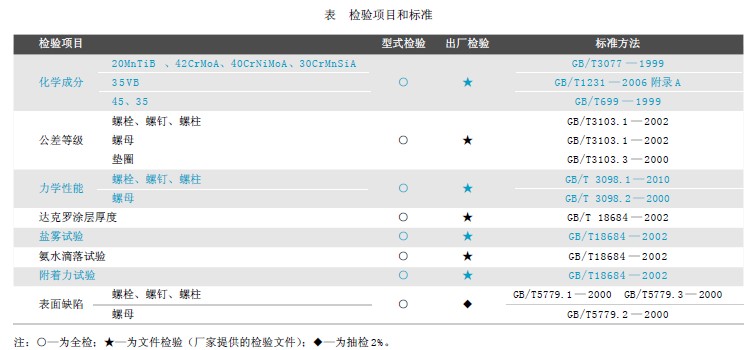 螺栓、螺釘、螺柱和螺母、墊圈所選用的材料的元素成分直接關(guān)系到緊固件的力學(xué)性能,所以不能低于推薦材料的要求。其他檢驗(yàn)項(xiàng)目和標(biāo)準(zhǔn)見下表。